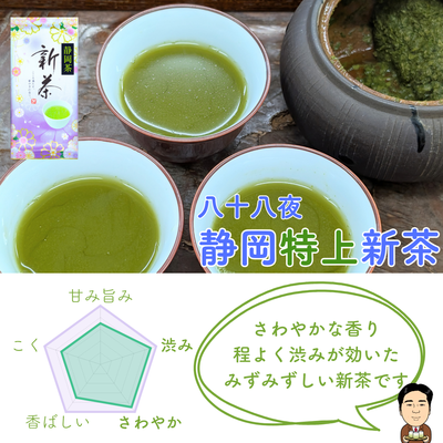 【予約】2026年産 静岡特上八十八夜新茶70g やぶきた品種 深蒸し煎茶 5月上旬頃より発送予定【メール便OK】 販売価格 1,188円(税込み) 会員価格 1,080円(税込み) 通常価格 1,296円(税込み) 在庫 50 商品コード JANコード ご要望欄(包装のご希望等ありましたらご入力ください) 数量 - + カートに入れる お気に入りリストへ追加する 入荷通知メールを希望する ポストする シェアする カテゴリー 静岡茶 キャンペーン 2026年産新茶| メール便可能商品(1000円以上で送料サービス中) RECOMMENDEDおすすめアイテム 【予約】2026年産新茶 伊勢特上新茶 深蒸し煎茶70g やぶきた品種 5月上旬頃より発送予定【メール便OK】 1,188円(税込み) 【予約】2026年産新茶 鹿児島 知覧特上新茶70g 深蒸し煎茶 5月上旬頃より発送予定【メール便OK】 1,188円(税込み) 【予約】2026年産静岡極上新茶50g 5月上旬頃より発送予定 深蒸し煎茶 やぶきた品種【メール便OK】 1,300円(税込み) 【予約】2026年産かごしま知覧極上新茶50g 4月下旬頃より発送予定 深蒸し煎茶 ゆたかみどり品種【メール便OK】 1,300円(税込み) 【予約】2026年産鹿児島大走り新茶50g 4月下旬頃より発送予定 極上深蒸し煎茶 さえみどり品種【メール便OK】 1,300円(税込み) 【予約】2026年産静岡極上新茶100g 5月上旬頃より発送予定 静岡県産 深蒸し煎茶 やぶきた品種【メール便OK】 1,944円(税込み) 【予約】2026年産かごしま知覧極上新茶100g 4月下旬頃より発送予定 深蒸し煎茶 ゆたかみどり品種 【メール便OK】 1,944円(税込み) 【予約】2026年産鹿児島大走り新茶100g 4月下旬頃より発送予定 極上深蒸し煎茶 さえみどり品種【メール便OK】 1,944円(税込み) CAMPAIGNキャンペーン 2026年産新茶 母の日好適!2026年産新茶ギフト メール便可能商品(1000円以上で送料サービス中) CATEGORYカテゴリー 深蒸し煎茶・煎茶 静岡茶 かごしま茶(知覧茶) 伊勢茶(三重県産) 茎茶(かりがね) ほうじ茶・玄米茶 日本茶ティーバッグ 日本茶ギフトセット 静岡茶ギフト かごしま茶(知覧茶)ギフト 伊勢茶ギフト 飲み比べギフト べにふうき粉末緑茶 抹茶(予約不可) 麦茶・健康茶など 茶器・小物など CALENDARカレンダー 2026年02月 日 月 火 水 木 金 土 1 2 3 4 5 6 7 8 9 10 11 12 13 14 15 16 17 18 19 20 21 22 23 24 25 26 27 28 2026年03月 日 月 火 水 木 金 土 1 2 3 4 5 6 7 8 9 10 11 12 13 14 15 16 17 18 19 20 21 22 23 24 25 26 27 28 29 30 31 発送休業日